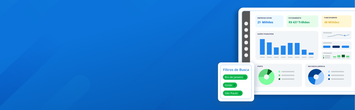 Você também consegue gerar listas de empresas abertas recentemente, empresas que estão contratando, empresas em recuperação judicial, empresas falidas, empresas optantes pelo simples, empresas importadoras e exportadoras e empresas com dívida ativa na União para a região de todo Brasil.